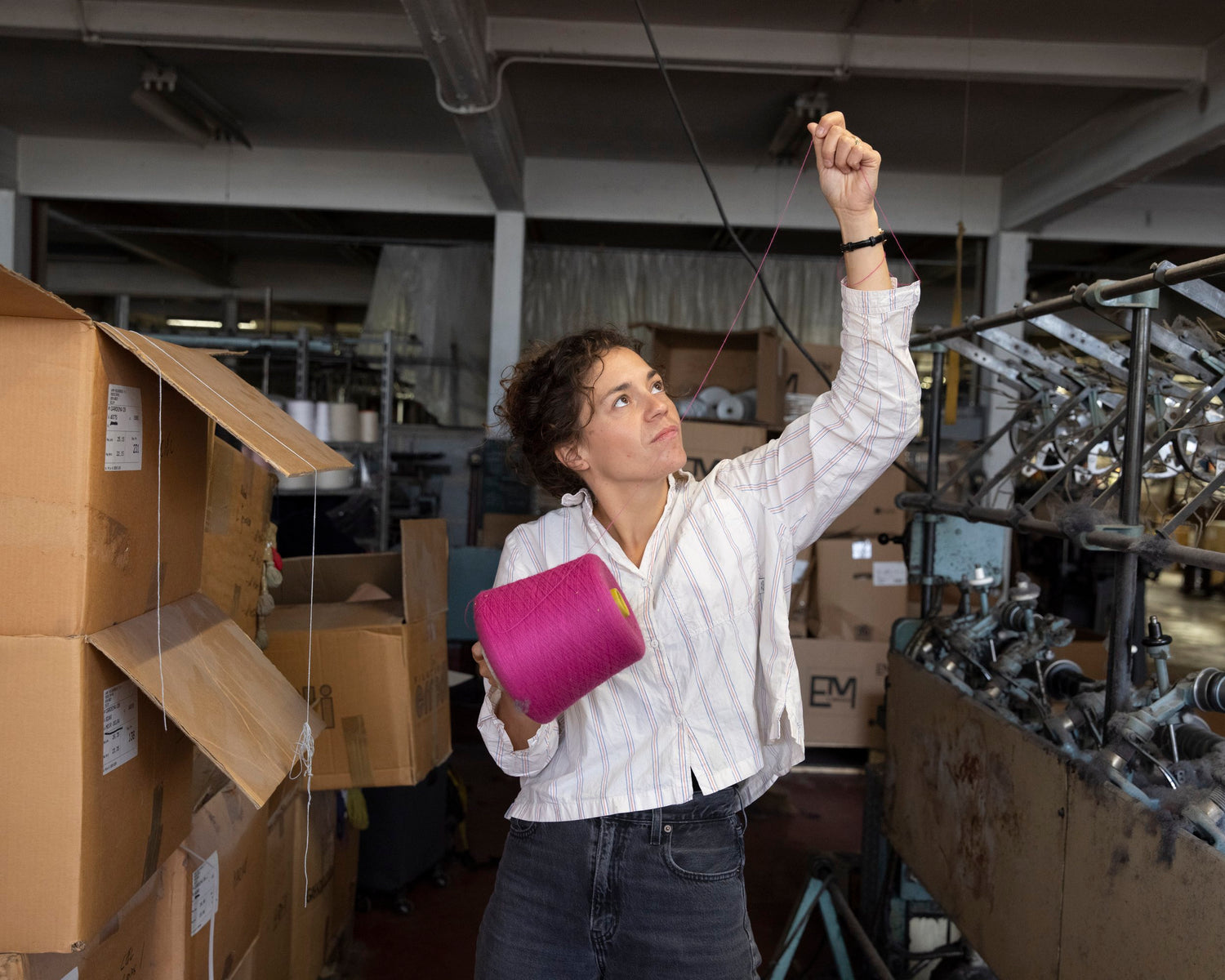 “Ons garen wordt gesponnen in Italië. Doordat wij maar in een kleine oplage werken, gebruiken we stockgaren. Dat betekent dat onze kleuren sowieso gesponnen worden voor een groter merk. Zo komt er niet speciaal voor ons een aparte lijn en blijft er geen ongebruikt garen liggen. We weten zo ook precies hoeveel kilo er van elk kleur in stock is, alles is geautomatiseerd. Niet veel spinnerijen werken zo, maar voor ons is het ideaal. Soms denk ik wel ‘dju, dat blauw mocht net een klein beetje minder donker’, maar aan de andere kant daagt het je ook uit om verrassende combinaties te maken.”