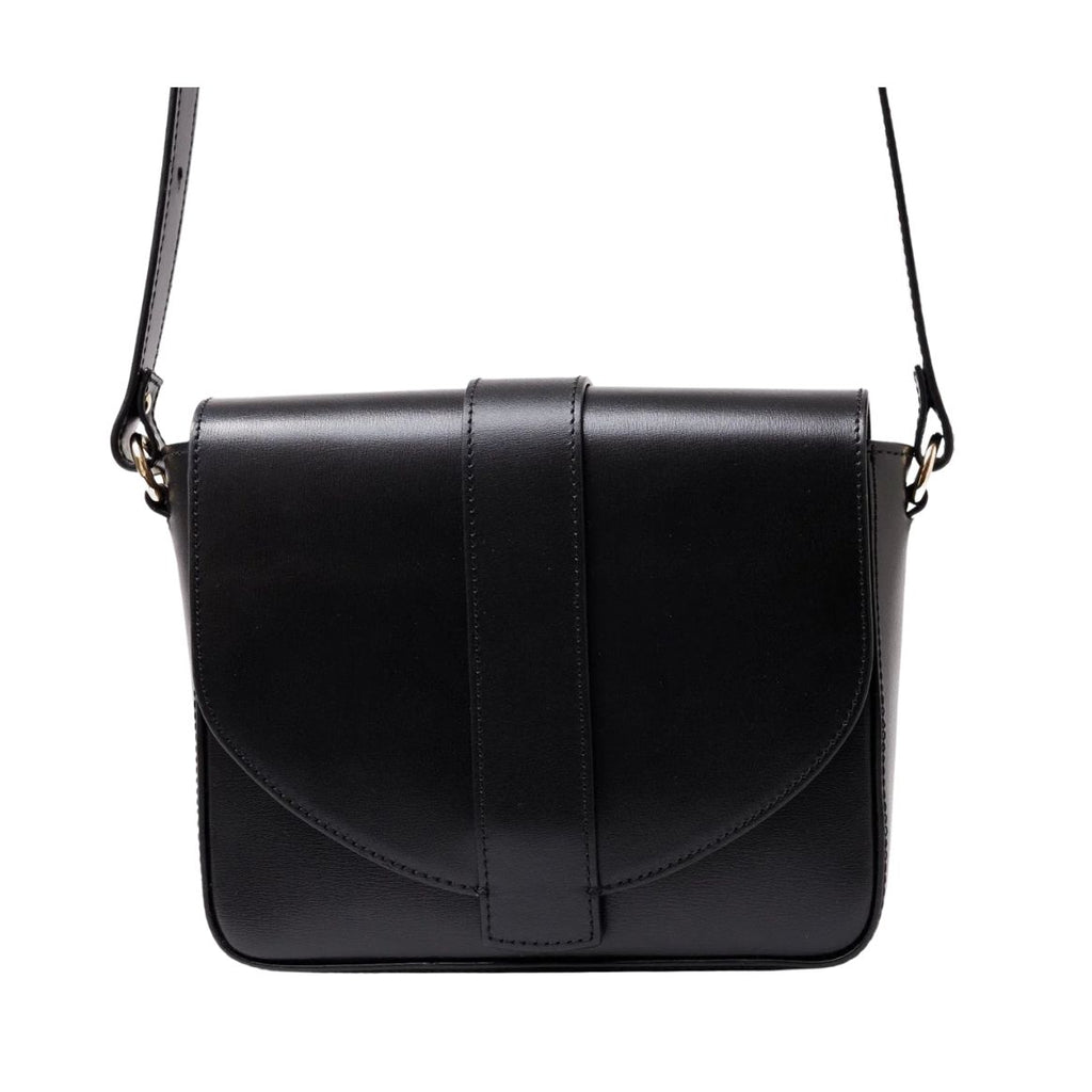 A black leather crossbody bag with adjustable strap. It has a spacious main compartment and a smaller additional pocket. Magnetic closure.