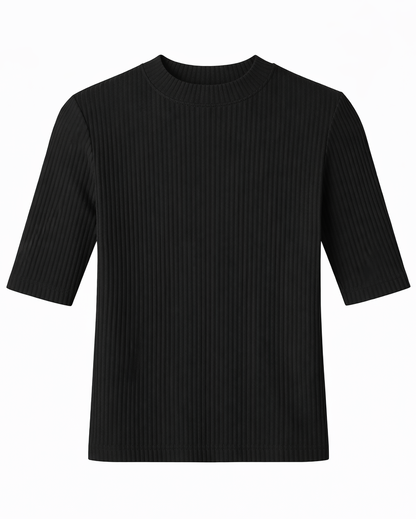Nina t-shirt is made from a flexible and comfy Tencel™ rib fabric which adapts to your body shape. It has a tiny turtle neck, is quite fitted and has sleeves that end just before the elbow. The material is slightly transparent.