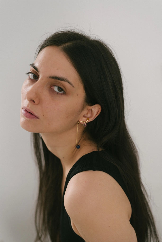 The Rose earrings are made from gold plated brass, mismatched earrings. Dyed agate, navy blue and yellow beads and a single pink crystal drop.
