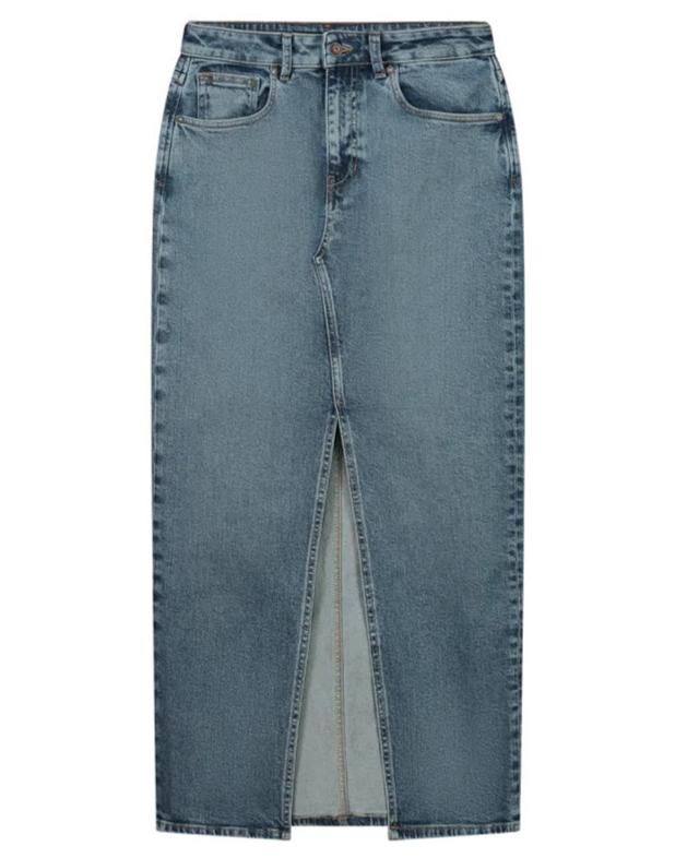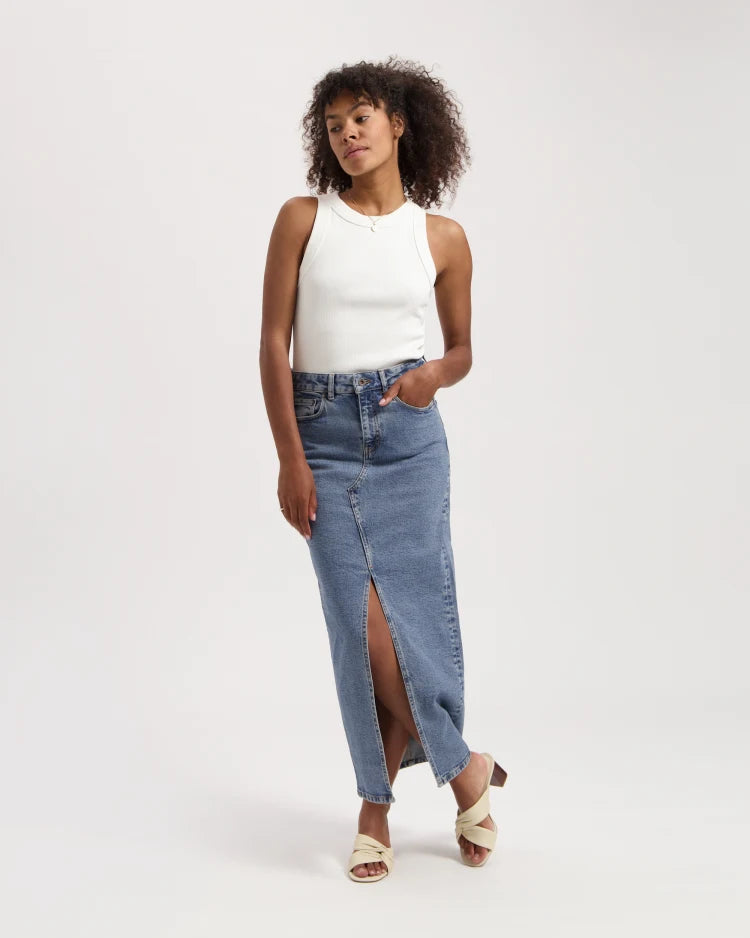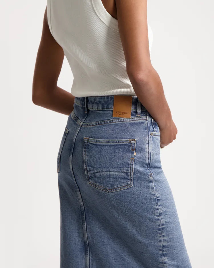 The Coda is a midi denim skirt with a front slit. The skirt is made from regenerative cotton. Regenerative farming practices improve soil health, increase biodiversity, and balance ecosystems.