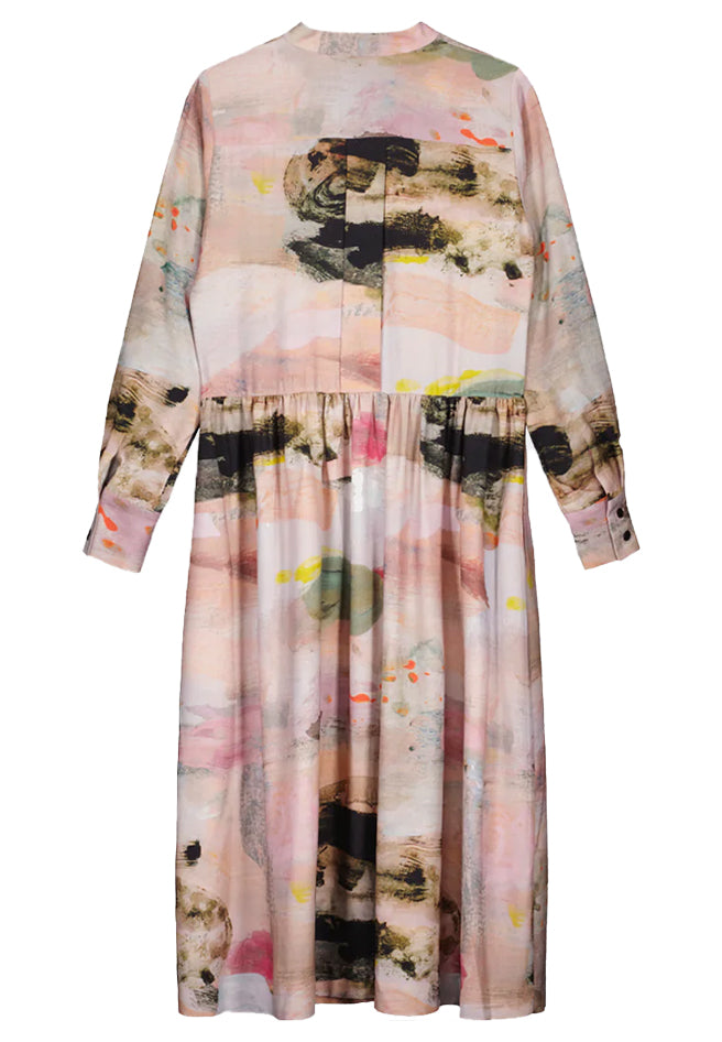 Women's long all-over printed dress with pockets on the side seams. Turtle collar, buttons at front. Long sleeves, high wrist band with slit and button at the back of the wrist band. A-lined hem. Tight fit.