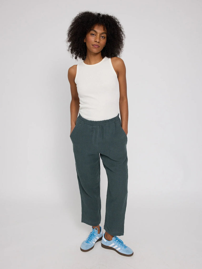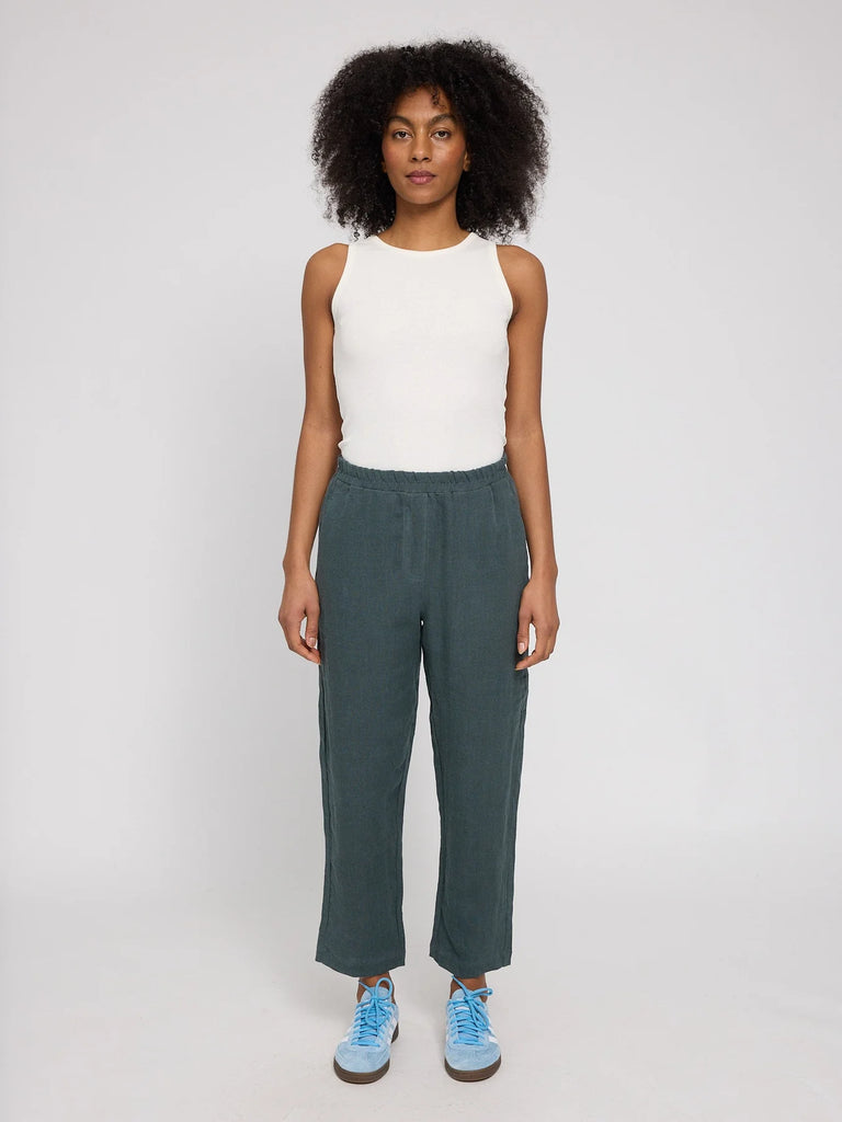 The Straight leg linen pants are a timeless classic for warm days. The straight leg creates an elongated silhouette and is easy to style in many ways. An elastic waistband ensures a comfortable fit without restriction. Made from 100% natural linen, the pants are highly breathable and feel cool on the skin. Side pockets are subtly integrated into the design. Linen is a durable natural fibre, known for its longevity and distinctive look.
