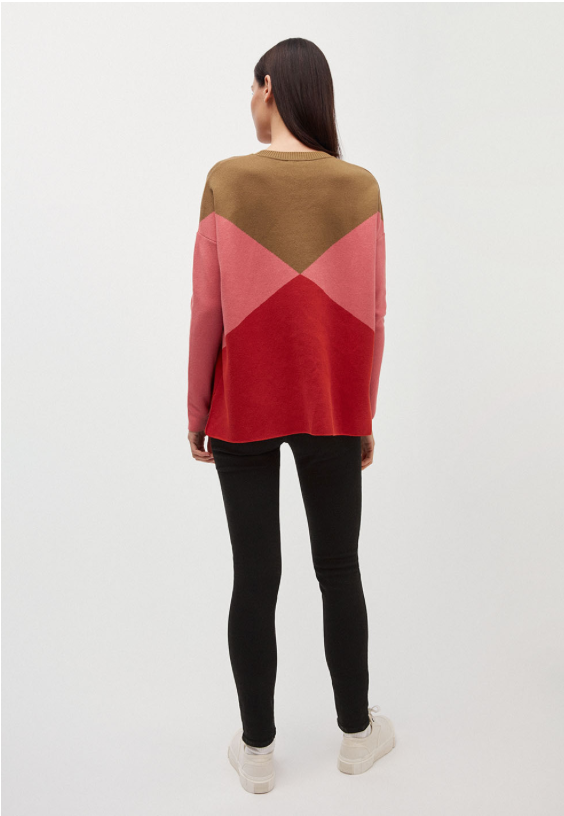 This jumper has a graphic pattern in khaki and rose tones.