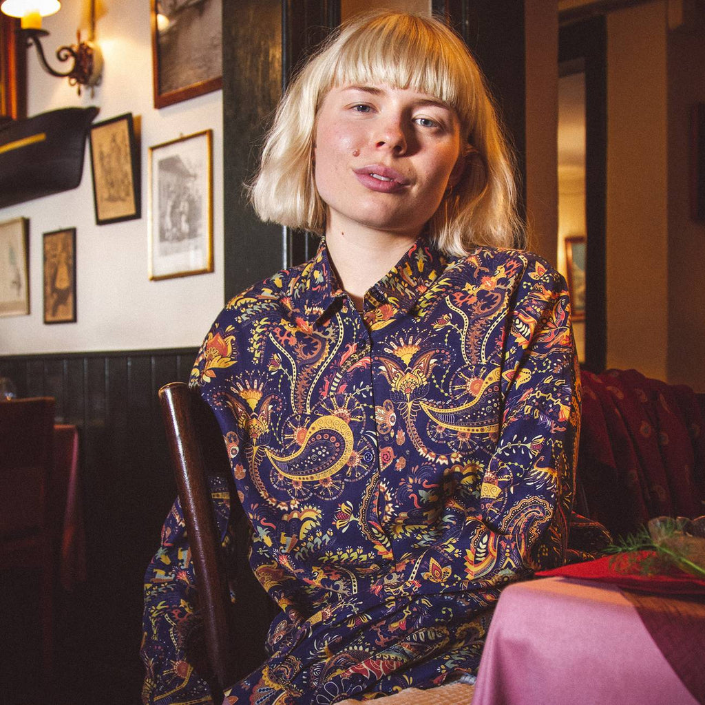 A long shirt with a paisley print.
