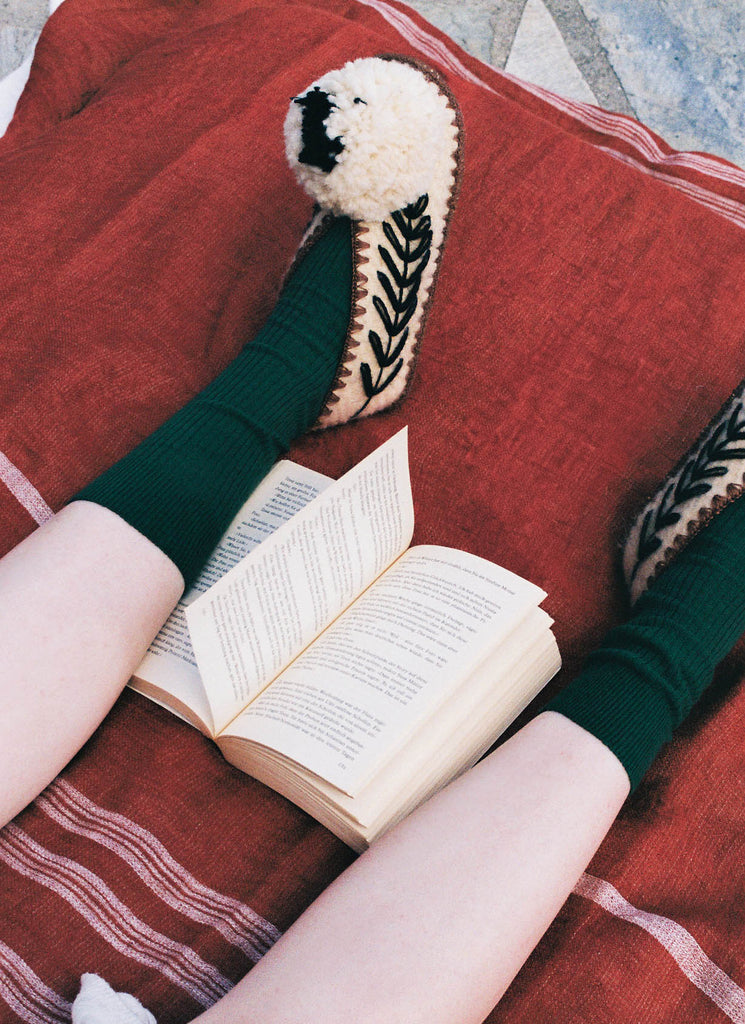 GIVE A PON slippers are handmade in a small workshop in Greece. The exterior of these slippers is made of undyed wool sourced from a white sheep. The stitching and pompons are made of wool and acrylic yarns. Leather sole.