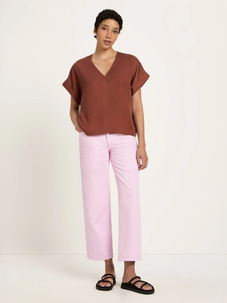 This Tencel™ Lyocell blouse has a flowing silhouette and a deep V-neck, giving the design a modern touch. The wide, short sleeves emphasize the lightness, while the breathable material ensures a comfortable fit. An elegant essential – perfect for everyday wear or special occasions.