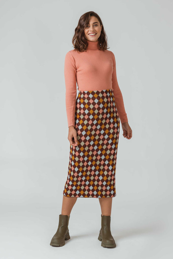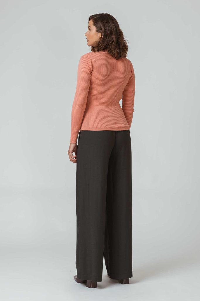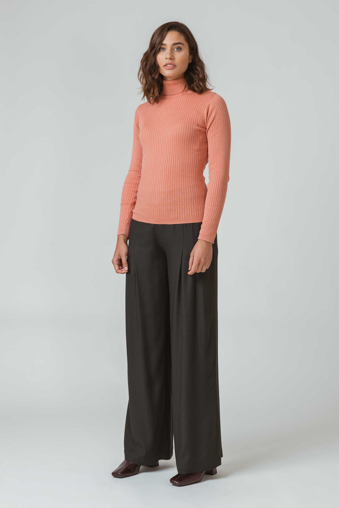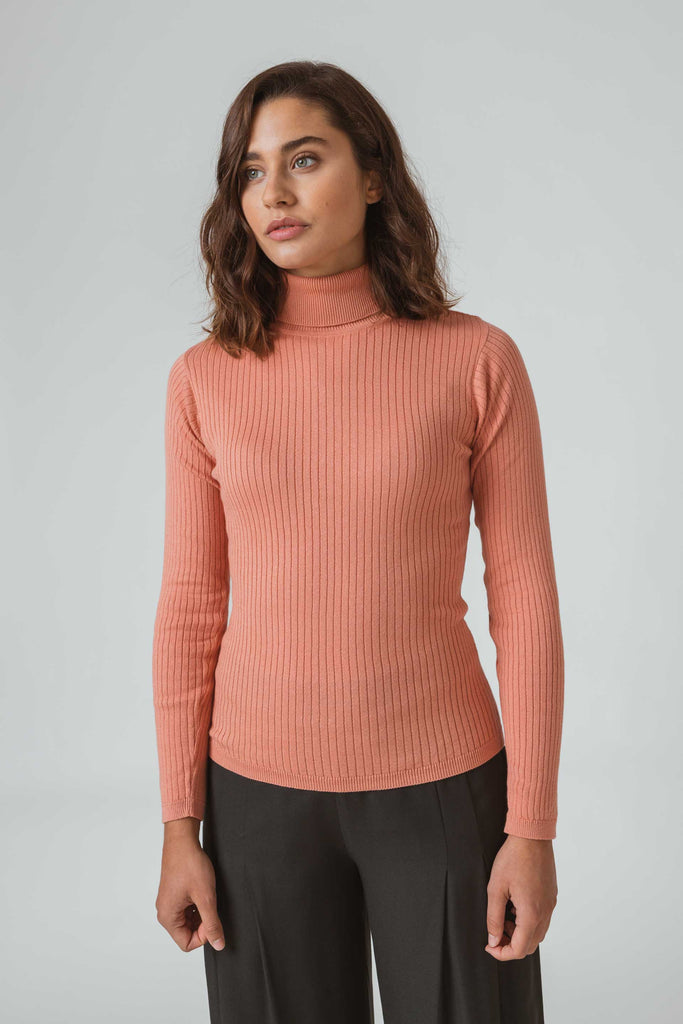 A long sleeve Top with a turtle neck, made of stretch organic cotton with a subtle texture. Organic cotton is grown by using methods and materials that have a low impact on the environment. This means no use of toxic fertilisers and pesticides and maintenance of soil fertility.