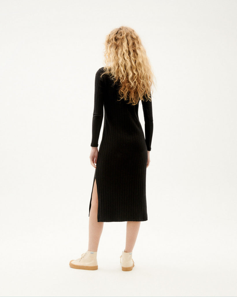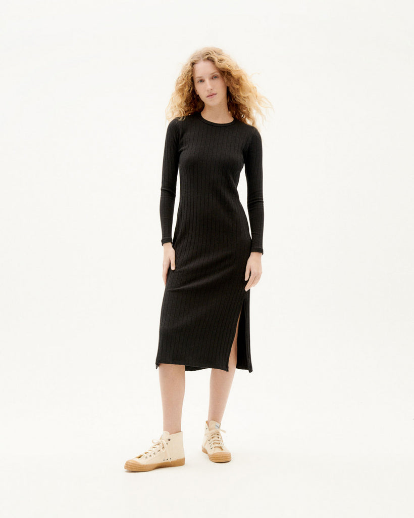 Gina is a fitted, ribbed dress with long sleeves, a round neck and side vent. Made from a blend of wool and recycled materials.